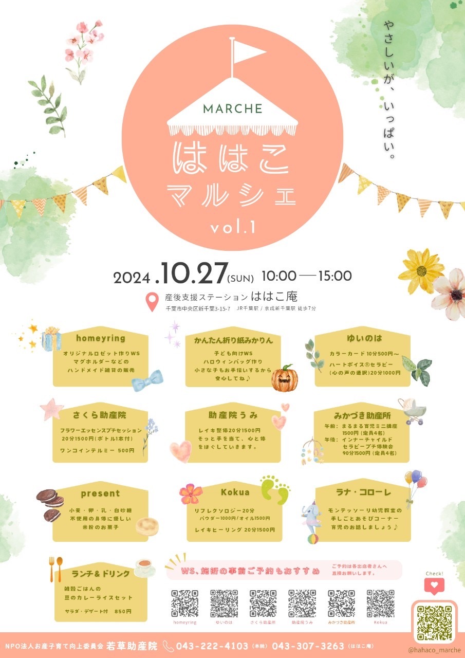 昨年、開院した若草助産院分院 産後支援ステーション 「ははこ庵」でマルシェを開催します。このマルシェは、助産院や助産院で働く助産師を知ってほしいという思いと、自然療法を体験してもらいたいという気持ちで、思いが同じお母さんヒーラーさんたちと開催することにしました。